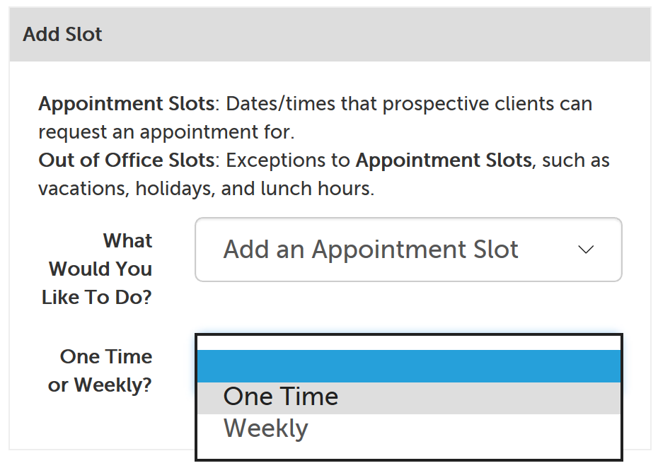 Appointment Slots allow you to list available dates and times on a public calendar, so that current and prospective clients can request a scheduled session, if the provider has the feature enabled. For a good overview of this feature, please see the video recording of a webinar we hosted on this type of virtual clinic.