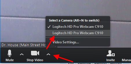 2. Click on the arrowhead to the RIGHT of the video camera icon, and a list of all detected cameras will appear. Click on the camera you would like to switch to.