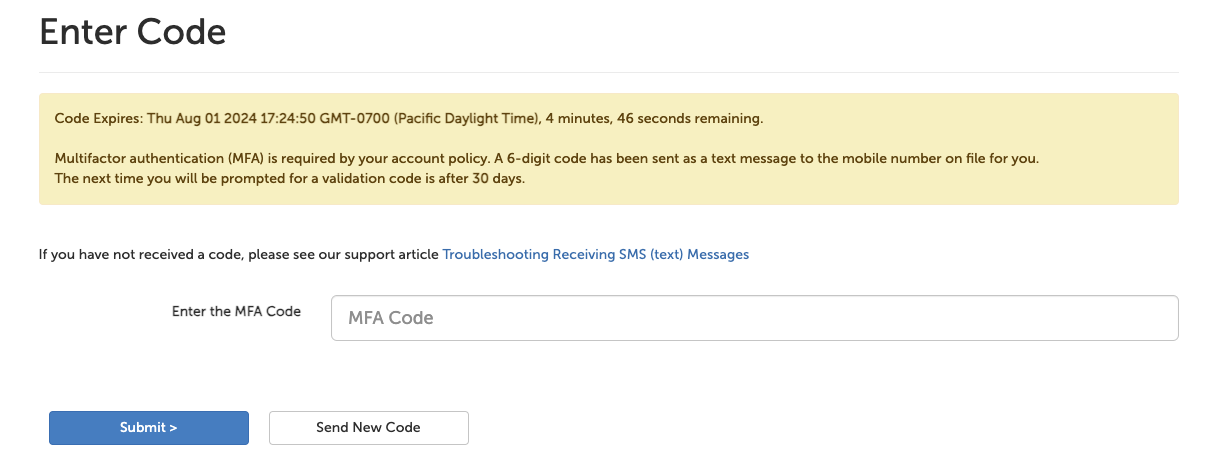 Multi-factor authentication requires you to have a cell phone number in your SecureVideo account, in the "Mobile Number to Receive Texts Instead of E-Mails" field. By default, the system will only prompt you for the Multi-Factor Validation Code once every 30 days (if you use the same browser and device), but this setting ("Multi-Factor Validation Code Expiration") can be changed as described below.