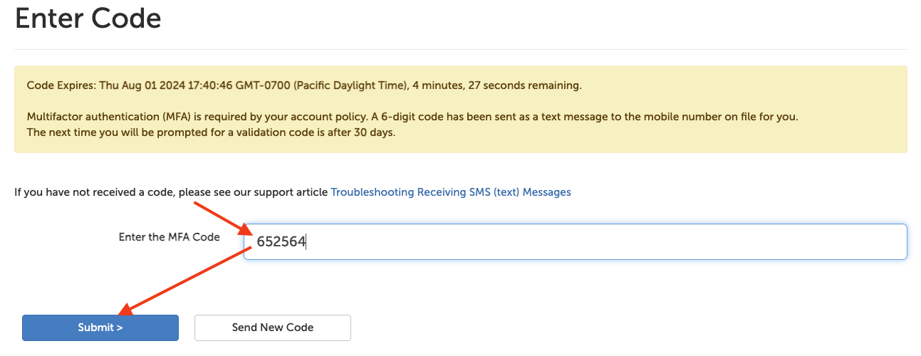 5. Enter this code into the page and then click the "Submit >" button to finish logging in.